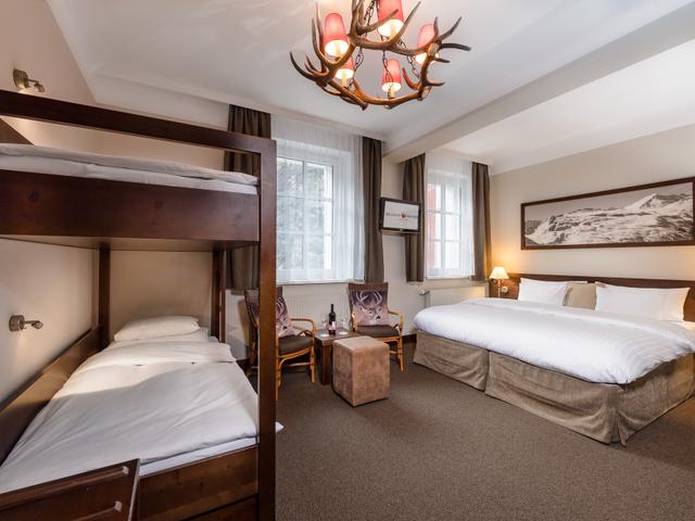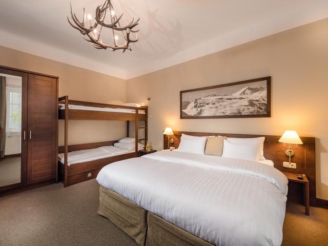 5-hengen huone, jossa DUX-parivuode, kerrossänky ja/tai 1-hengen vuode, kylpy/suihku ja WC.