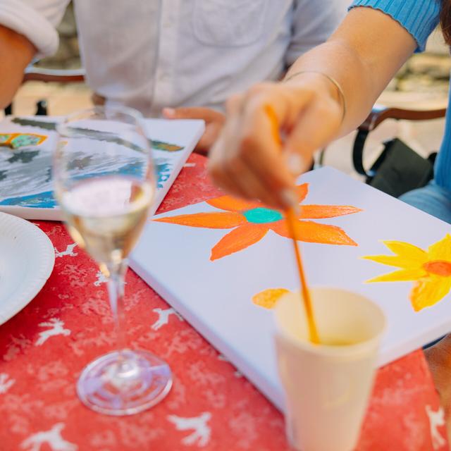 Palattuamme hotelliin meitä odottaa "Canvas & Cava" – maalaamme tauluja ja nautimme kuohujuomaa Hotel Salzburger Hofin terassilla.