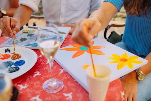 Palattuamme hotelliin meitä odottaa "Canvas & Cava" – maalaamme tauluja ja nautimme kuohujuomaa Hotel Salzburger Hofin terassilla.